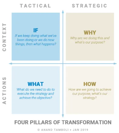 Disruptions, not just this pandemic but even other kinds, often add to your difficulties. Covid-19 has forced many companies to speed up their transformation initiatives, but as the pandemic progresses, how can you lead and make some meaningful impact? The answer lies in four critical questions: why, how, if, and what. The questions like why and how are very strategic, while if and what questions are tactical.